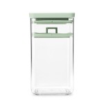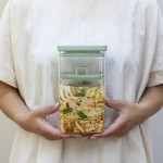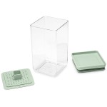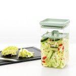 מיכל 1.6 ליטר שקוף, מכסה עם אטימת סיליקון ודוחס ירוק ג׳ייד ששומר על הירקות שקועים בנוזל.
