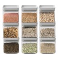 סט 9 מיכלי פלסטיק ברבנטיה בעיצוב ריבועי חסכוני במקום, אפשרות לאחסון מודולרי אחד על השנימיכלי פלסטיק שקוף, חזק במיוחד SAN, ללא BPAמכסה אפור בהיר אטימת סיליקון שומרת על האוכל טרי ליותר זמןבטוח לניקוי במדיח5 שנות אחריותמידות: מיכלי 0.7 ליטר, רוחב - 11 ס״מ , עומק - 11 ס״מ, גובה - 10.5 ס״מ (מק״ט Y-122446)